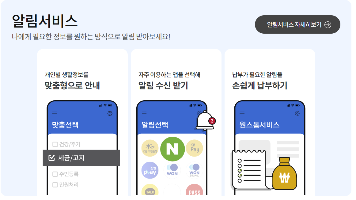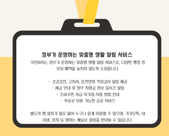 건강검진, 고지서, 운전면허 적성검사, 세금 안내뿐 아니라 정부 지원금·소비쿠폰 지급 알림까지 실시간으로 받아볼 수 있는 똑똑한 서비스입니다.