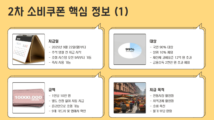 2025년 추석을 앞두고 정부가 국민 90%에게 1인당 10만 원의 2차 소비쿠폰을 지급하고 있습니다.