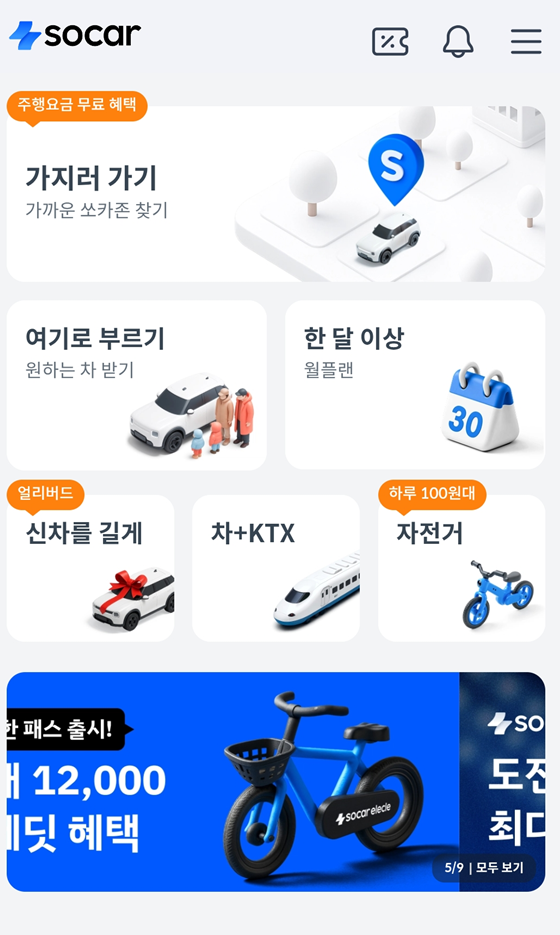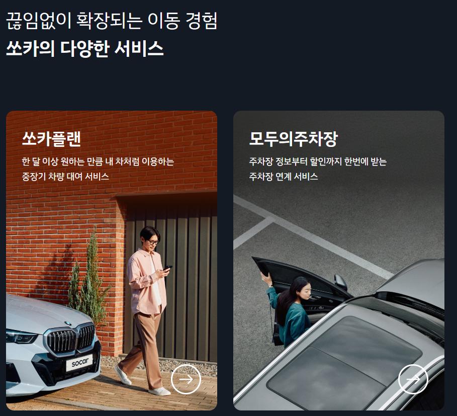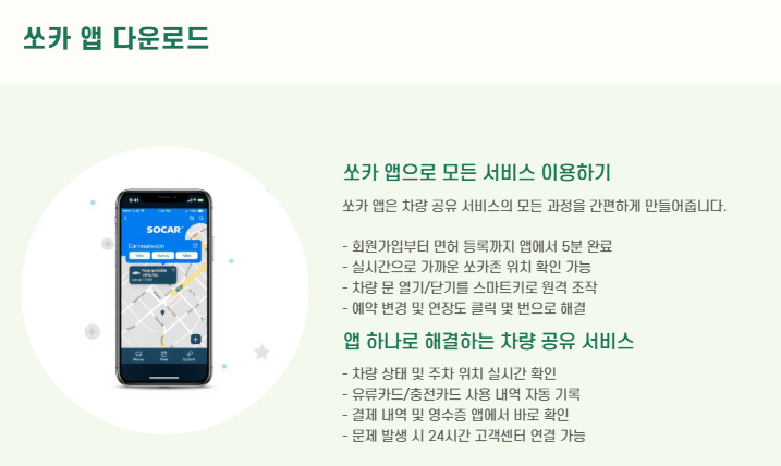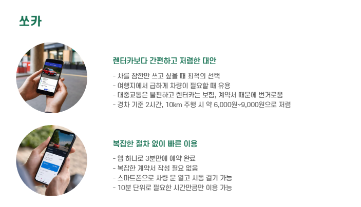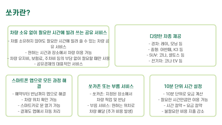 쏘카는 차를 소유하지 않아도 필요한 시간에 빌려 쓸 수 있는 차량 공유 서비스입니다.