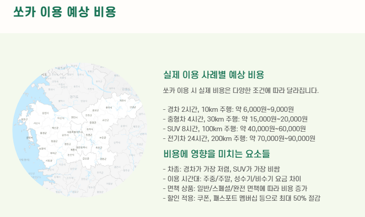 * 예시: 경차로 2시간, 10km 주행 시 → 약 6,000원 ~ 9,000원 수준 (할인/옵션에 따라 변동)