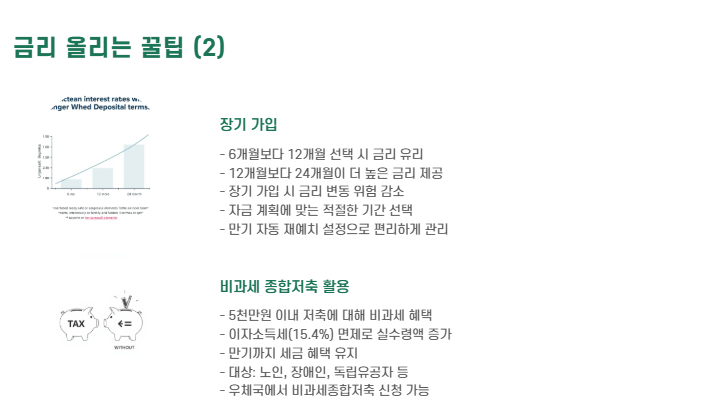 - 조건 충족 시 세금(15.4%) 면제 → 실수령 이자 ↑