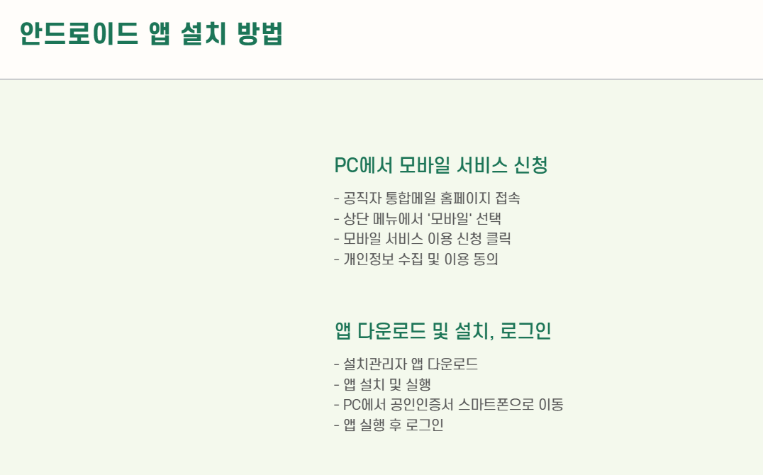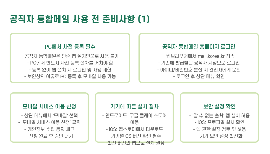 공직자 통합메일은 단순한 앱 설치만으로는 사용이 불가능하며, 반드시 아래 절차를 따라야 합니다: