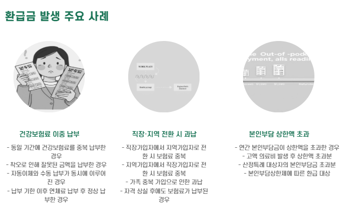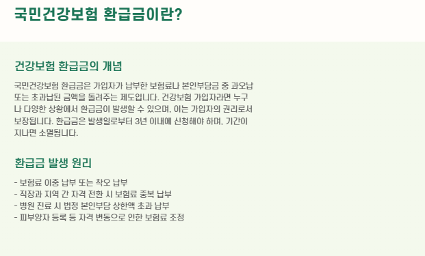 국민건강보험 환급금은 가입자가 납부한 보험료나 본인부담금 중 과오납 또는 초과납된 금액을 돌려주는 제도입니다.