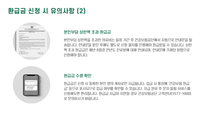 - 상한액 초과 본인부담 환급금은 일정 기간 후 자동 안내문 발송 후 지급됩니다.