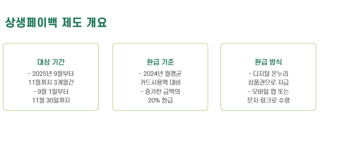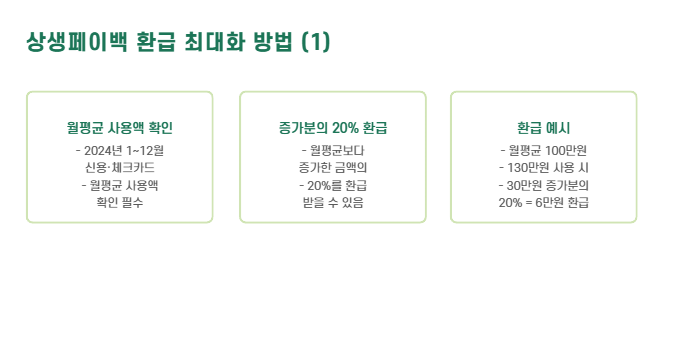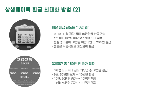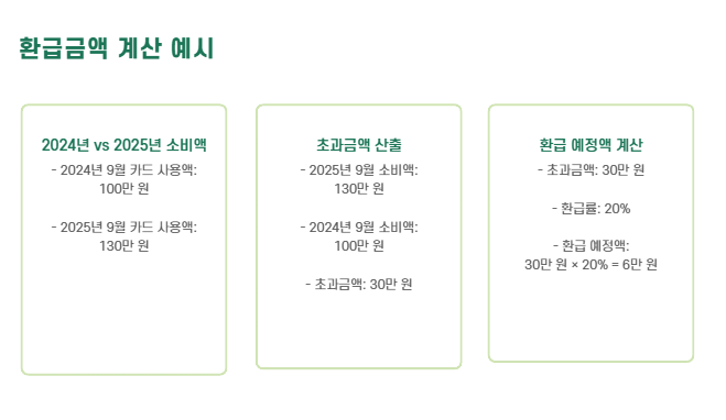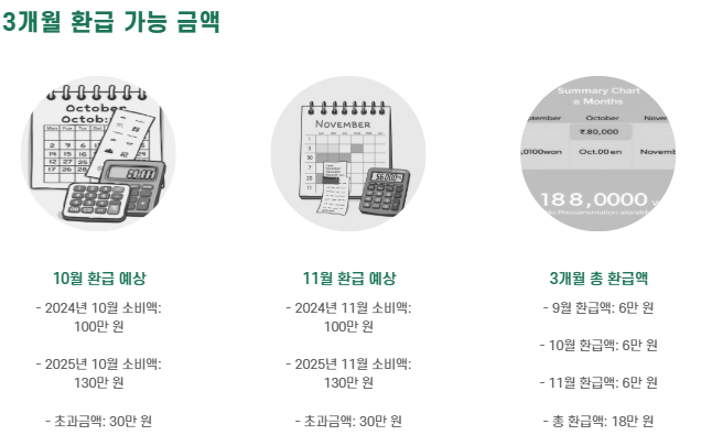 - 예) 월평균이 100만 원이었다면, 9~11월에 130만 원 이상 사용 시 6만 원 환급 가능 (30만 원 증가 × 20%)
