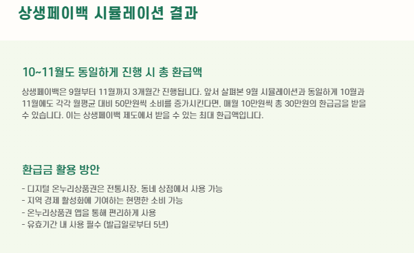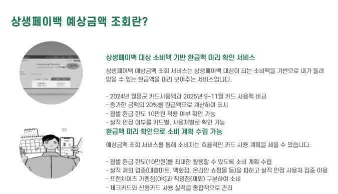 예상금액 조회는 상생페이백 대상이 되는 소비액을 기반으로 내가 돌려받을 수 있는 환급액을 미리 보여주는 서비스입니다.