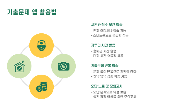 특히, 기출문제 반복 학습·오답 노트·모의고사 기능이 포함된 앱을 활용하면 실전 감각을 키우는 데 큰 도움이 됩니다.