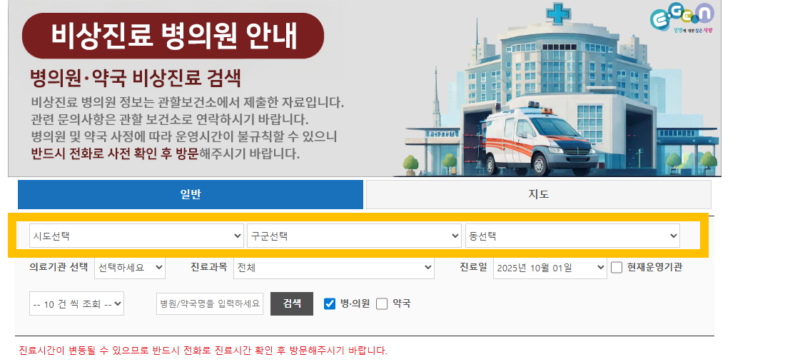 응급의료포털 E-Gen 홈페이지에서 시,군,구 선택만으로도 당일 기준 운영 중인 병원과 약국을 확인할 수 있습니다.