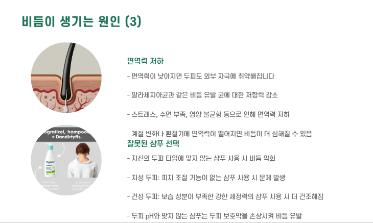 - 면역력이 낮아지면 두피에도 쉽게 염증이 생기고 비듬이 많아질 수 있습니다.