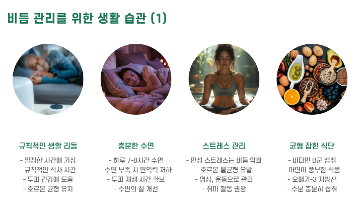 - 수면 부족, 불규칙한 식사, 음주 등은 두피 건강을 악화시킵니다.