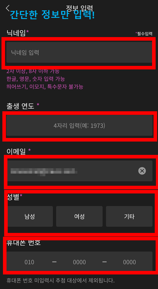 닉네임, 나이, 성별 정도만 적으면 끝!