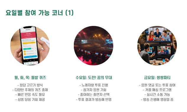 아침마당, 열린음악회, 전국노래자랑 같은 방송에 퀴즈 참여, 투표, 응원 댓글을 남길 수 있습니다.