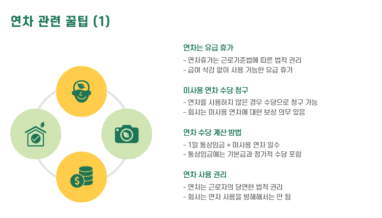 - 연차는 “유급”입니다. 미사용 시 수당으로 청구 가능