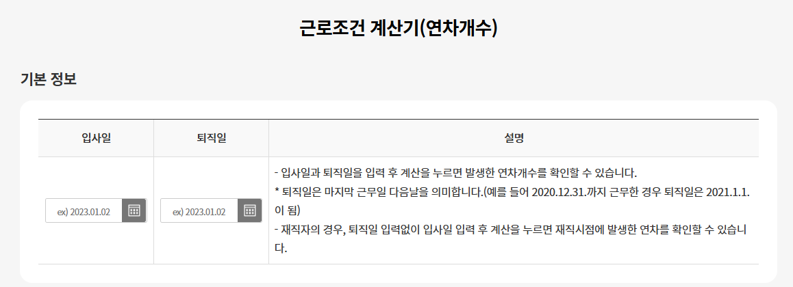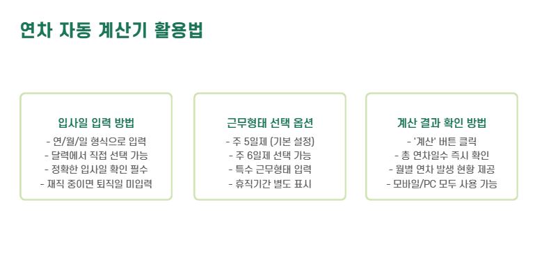 입사일과 근무형태(주 5일제, 주 6일제 등) 입력만 하면 자동으로 연차 일수를 계산합니다.