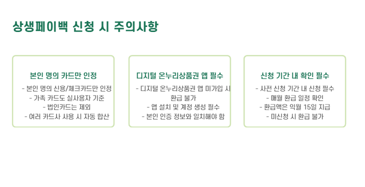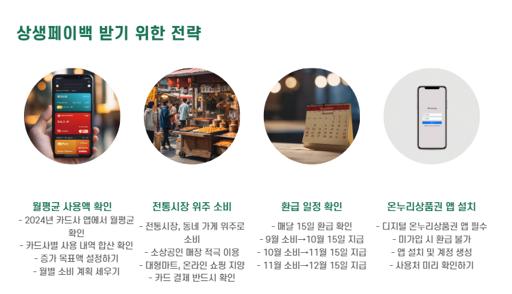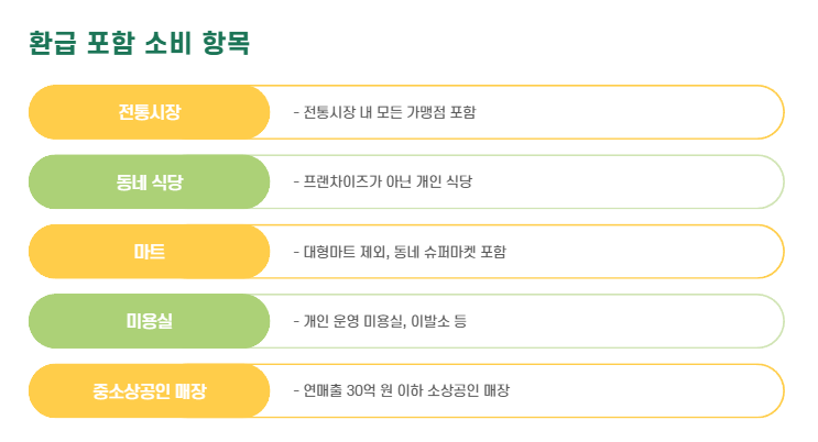 | 전통시장, 동네 식당, 마트, 미용실, 중소상공인 매장 등 | 대형마트, 백화점, 온라인 쇼핑, 배달앱, 유흥업소, 세금/보험료 납부 등 |