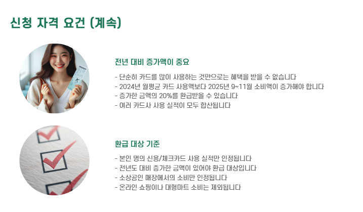 2024년 카드 소비액보다 2025년 9~11월 소비액이 증가한 국민에게 증가한 소비액의 20%를 디지털 온누리상품권으로 환급해주는 제도입니다.