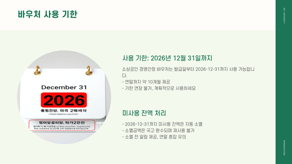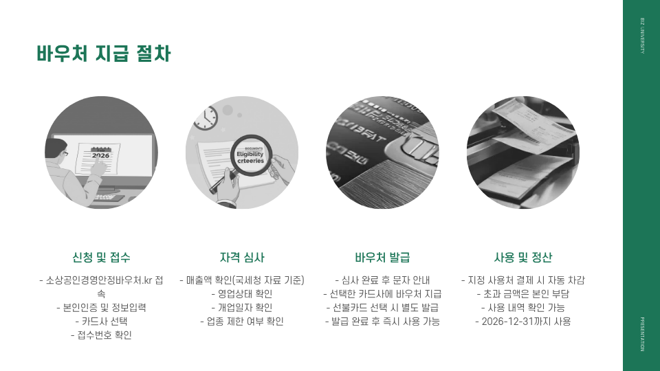 2026년에도 소상공인을 위한 직접적인 정부 지원이 이어집니다. ‘2026 소상공인 경영안정 바우처(지원금)’는 연매출 1억 400만 원 미만의 영세 소상공인을 대상으로 하며, 공과금·4대 보험료·차량연료비 등 고정비용에 사용할 수 있도록 25만 원 상당의 바우처가 지급됩니다.