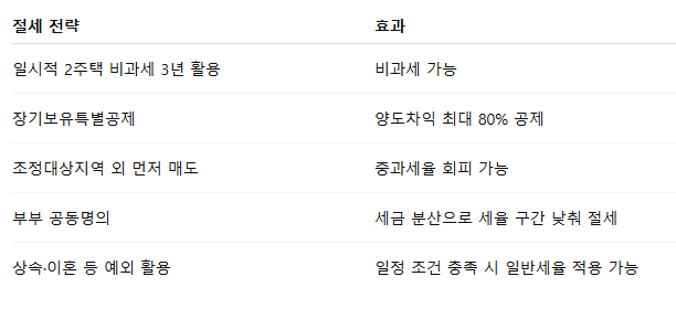 - 2주택 중 조정대상지역이 아닌 주택을 먼저 매도하면 중과를 피할 수 있음