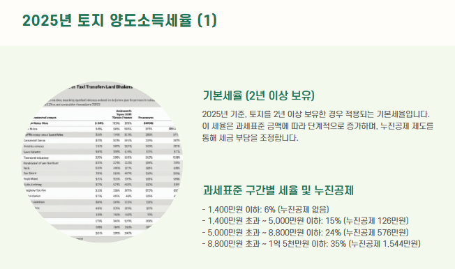 2025년 기준 토지 양도소득세율은 보유 기간과 과세표준에 따라 다음과 같이 적용됩니다.