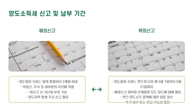 - 확정신고: 양도일이 속하는 연도의 다음 해 5월 1일부터 5월 31일까지