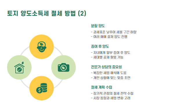 - 대상: 넓은 토지를 한 번에 매도할 경우 고세율 구간에 진입