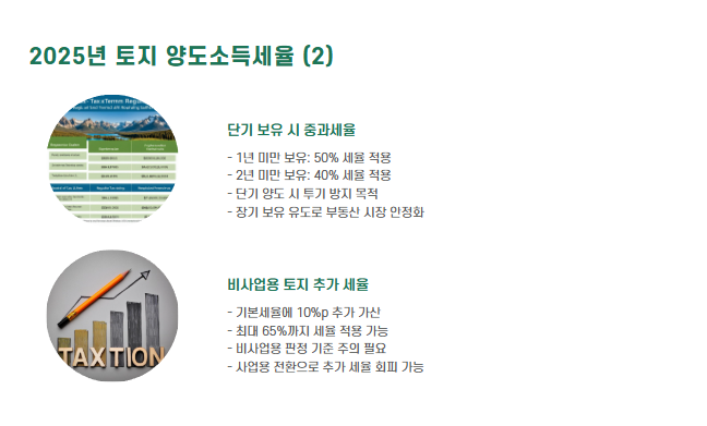 - 비사업용 토지란?: 실제로 사용하지 않는 나대지나 농지, 임야 등이 여기에 해당합니다. 이 경우 양도세율 10% 가산.