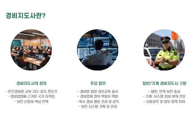 경비지도사는 민간경비원 교육·지도·감독을 수행하는 전문 자격자입니다. 일반경비지도사와 기계경비지도사로 나뉘며, 주로 아래와 같은 업무를 수행합니다: