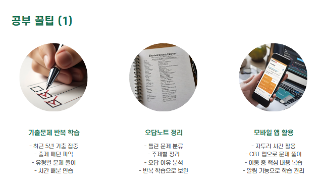 - 5개년 기출문제를 과목별로 나누어 풀고, 오답유형은 테마별 정리를 해두세요.
