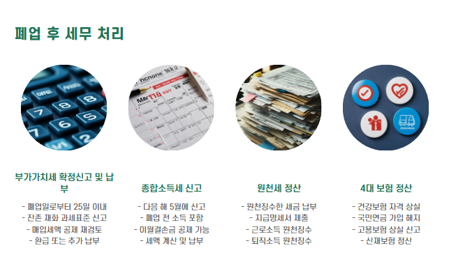 - 건강보험: 건강보험공단에 폐업 통보 및 직장 가입자 탈퇴 처리