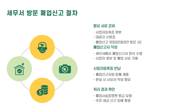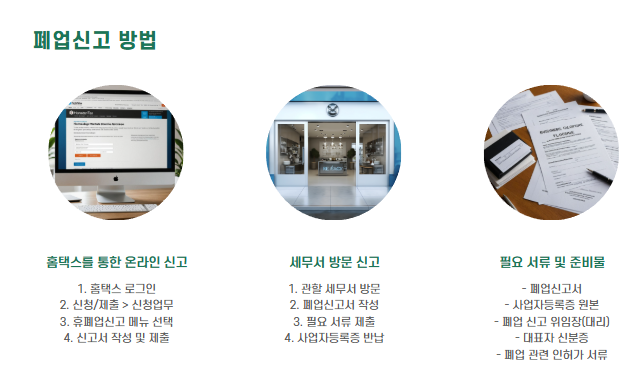 | 필요 서류 | 폐업신고서, 사업자등록증, 신분증 등 |