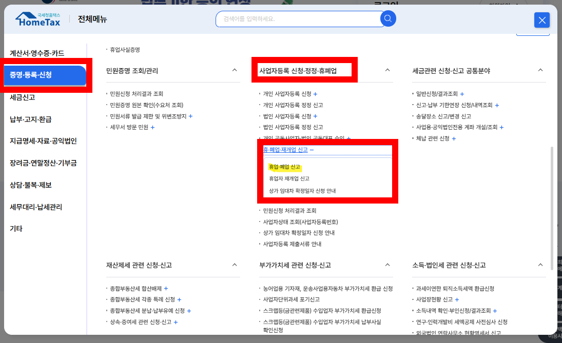 홈택스> 신청/제출 > 휴·폐업신고 메뉴에서 진행