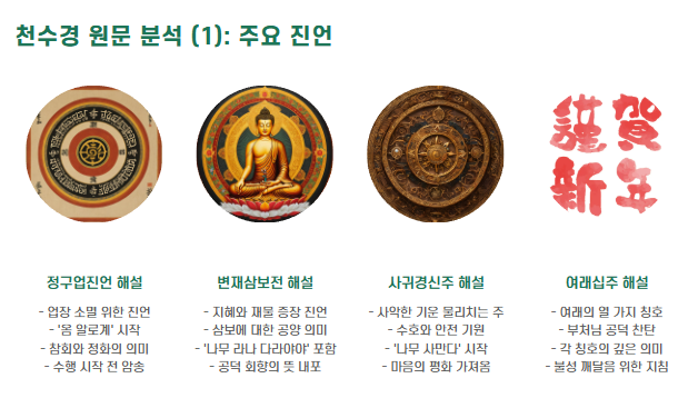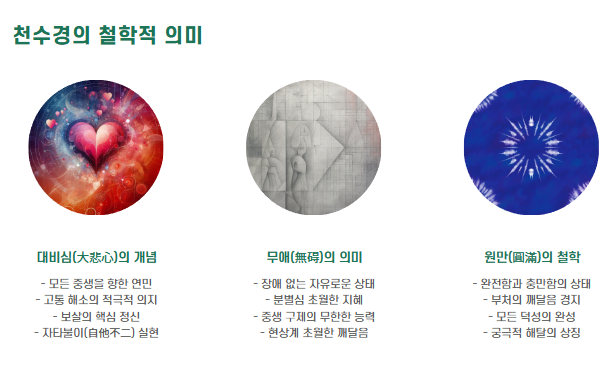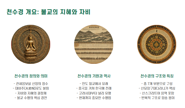 천수경은 불교 수행의 핵심 경전으로, 관세음보살의 자비와 지혜를 담고 있습니다.