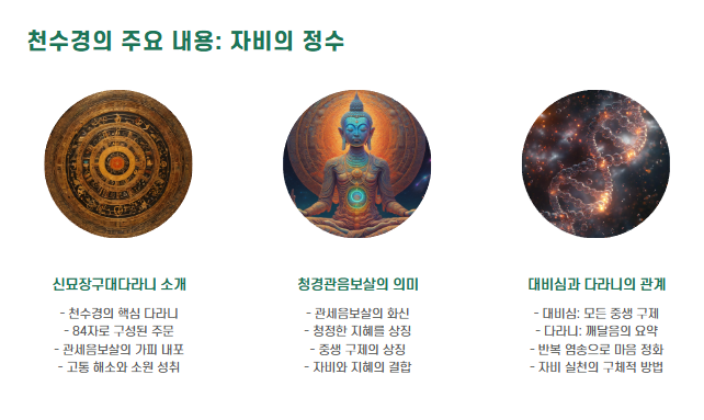 천수경의 핵심은 관세음보살의 ‘천 개의 손과 눈’을 상징하는 대비진언(신묘장구대다라니)입니다. 이는 “모든 중생을 보고(千眼) 도와주며(千手), 일체 고통을 구제한다”는 깊은 자비의 상징이며, 불자들은 이를 통해 자신의 마음을 정화하고 부처님의 가르침을 체득하고자 합니다.