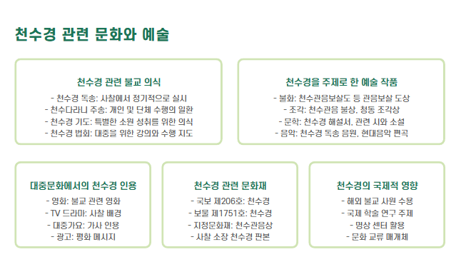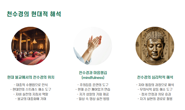 실제 천수경은 단순한 경전 독송을 넘어서, 마음 수양, 수행의 기초, 가정 평안, 소원 성취 등을 위한 불교적 실천 방법으로 오랜 세월에 걸쳐 이어져 왔습니다. 특히 새벽 예불, 49재, 기도회 등에서 빠짐없이 낭송되며, 모든 불자의 마음을 하나로 모으는 중심 경전 역할을 합니다.