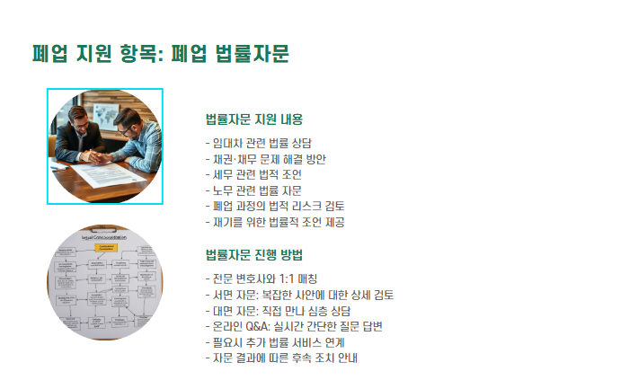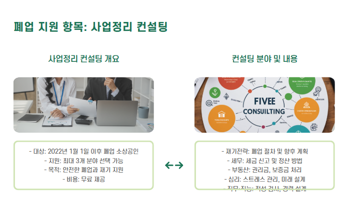 - 내용: 폐업 절차, 세금 신고, 권리금 처리, 심리 상담, 적성 검사 등