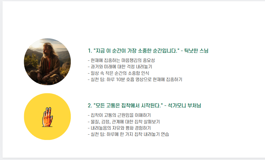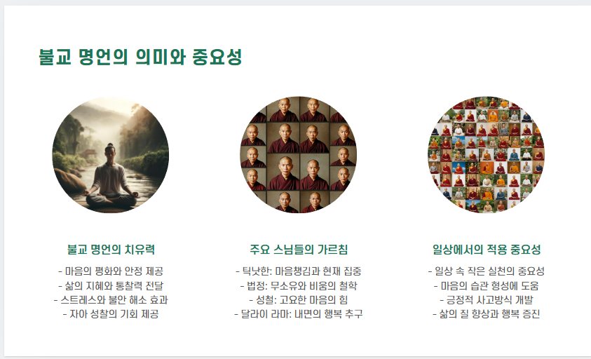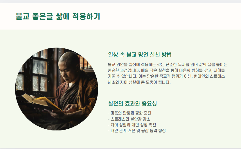 아래는 일상 속에서 불교 명언을 적용하는 실천 팁입니다.