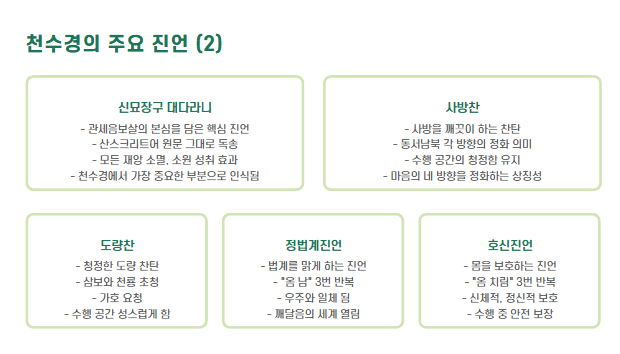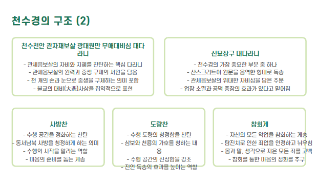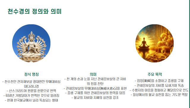 - 의미: “천 개의 손과 눈을 지닌 관세음보살의 큰 자비의 힘을 찬탄하는 경전”