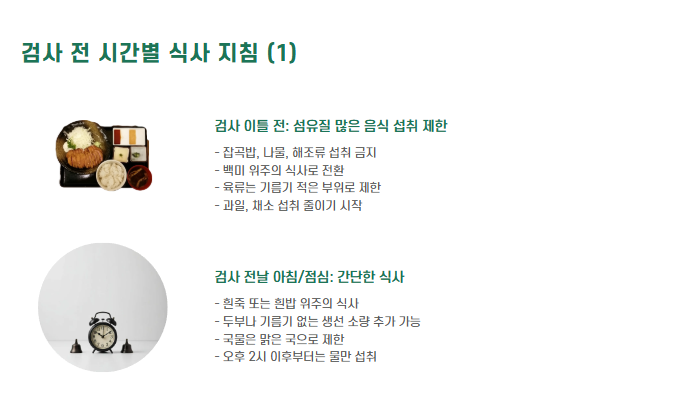 섬유질 많은 음식 섭취 제한 시작 (잡곡밥, 나물, 해조류 금지) - 검사 전날 아침/점심