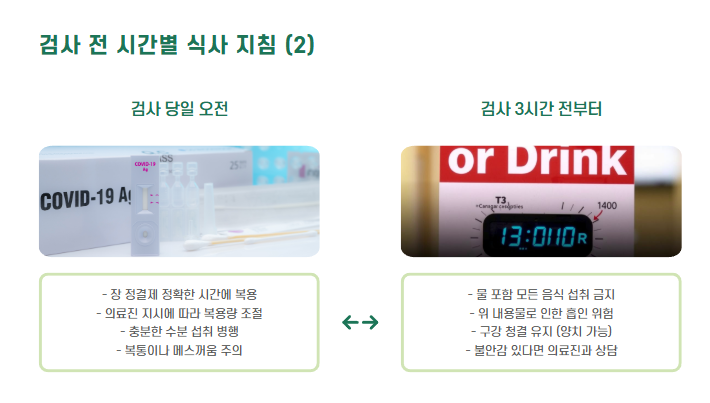 식사 금지, 물은 충분히 섭취 (장 정결제 준비) - 검사 당일