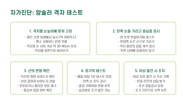 - 선이 휘어 보이거나, 끊겨 보이거나, 중심이 흐려 보이면 황반변성 의심