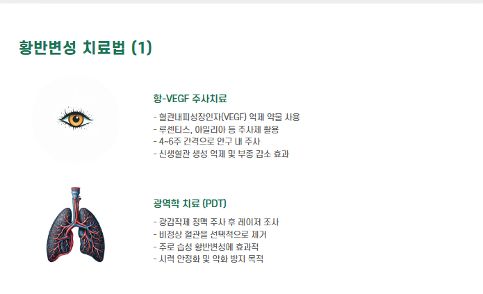 - 치료 방식: 황반변성, 특히 습성 타입 치료에 가장 많이 사용되는 방법입니다.
