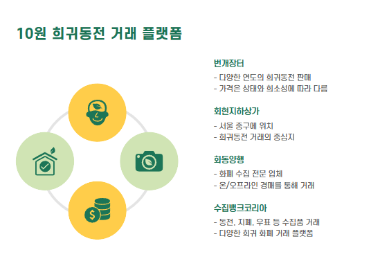 - 번개장터: 다양한 연도의 희귀동전이 판매되고 있으며, 가격은 상태와 희소성에 따라 다름