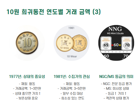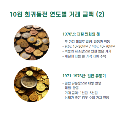 - 재질의 차이: 같은 연도라도 재질이 다른 경우(예: 1970년 황동 vs. 적동) 가치에 차이 생김