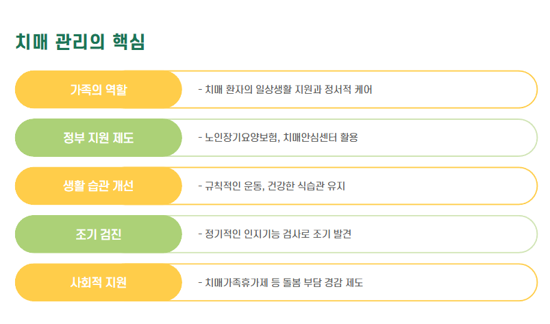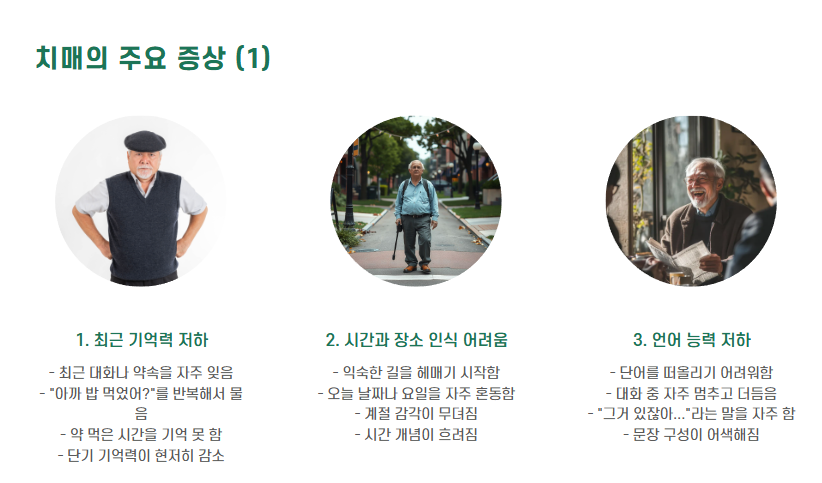 - 치매안심센터 지원: 전문상담, 복약관리, 가족 교육 프로그램 운영