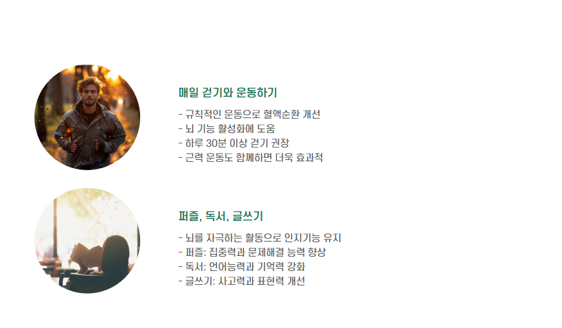- 매일 걷기와 운동하기: 혈액순환과 뇌기능 활성화