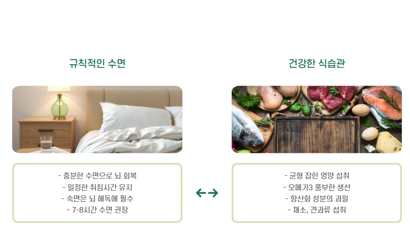 - 규칙적인 수면: 숙면은 뇌 해독 작용에 필수