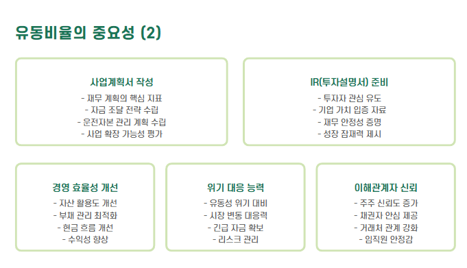 - 유동성 부족은 현금흐름 위기나 부도 위험으로 해석될 수 있어, 투자 결정에 있어 중요한 판단 요소입니다.