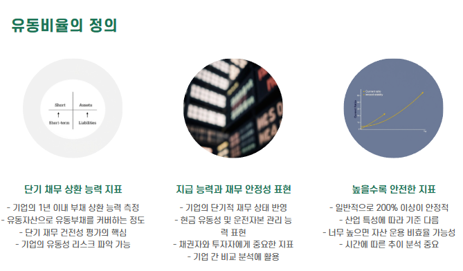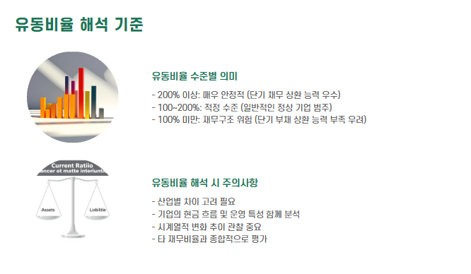 - 반면, 유동비율이 200% 이상이면 자금 여력이 충분한 기업으로 판단되며 신뢰도가 높아집니다.