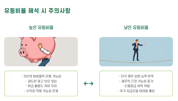 * 유동비율이 너무 높을 경우에도 자산을 비효율적으로 운용하고 있다는 신호일 수 있어 주의가 필요합니다.