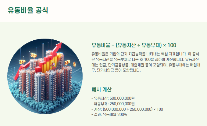 유동비율은 기업의 단기 상환 능력을 보여주는 핵심 재무 지표입니다. 투자, 대출, 사업계획 수립 시 꼭 참고해야 할 기준입니다.